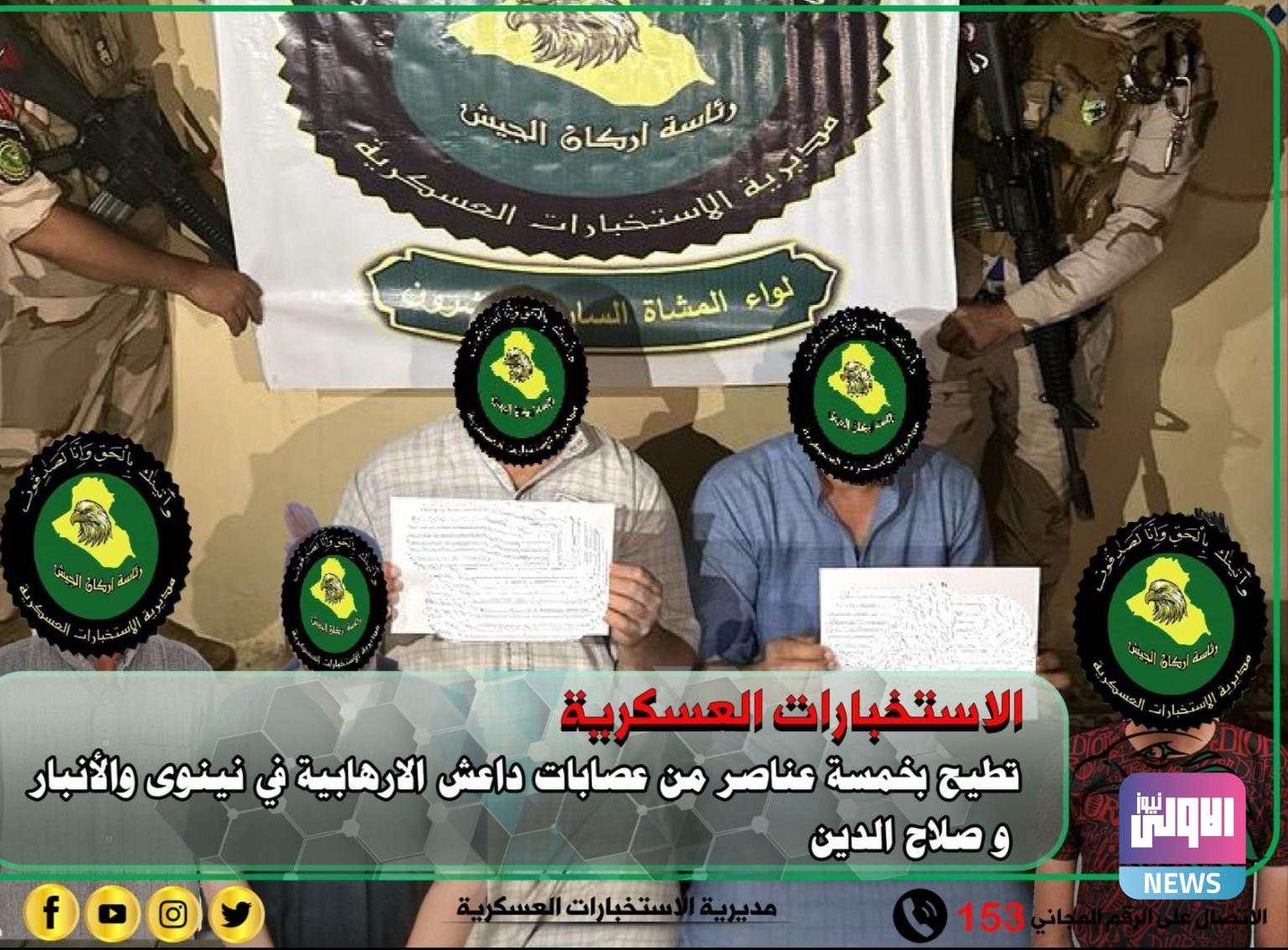 أعلنت وكالة الاستخبارات العسكرية، اليوم الثلاثاء، الإطاحة بخمسة عناصر من عصابات داعش الارهابية في نينوى والأنبار وصلاح الدين.