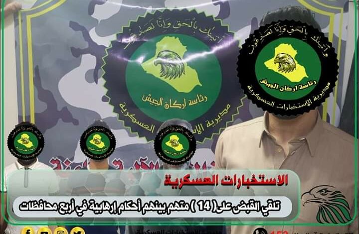 أعلنت مديرية الاستخبارات العسكرية التابعة لوزارة الدفاع، اليوم الخميس، القبض على 14 متهماً أحدهم وفق المادة 4 إرهاب.
