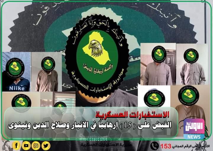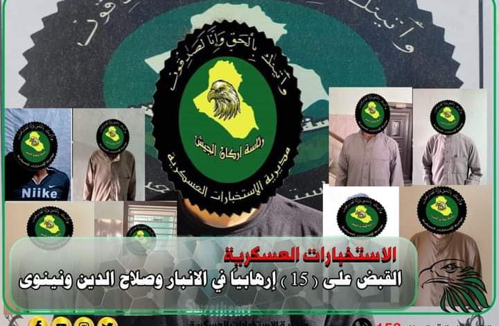 أعلنت مديرية الاستخبارات العسكرية، اليوم الخميس، القبض على 15 إرهابياً في الأنبار وصلاح الدين ونينوى.