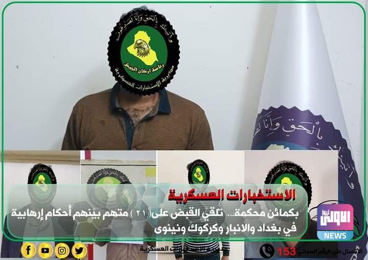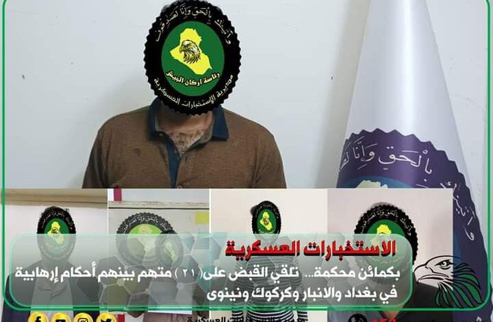 اعلنت مديرية الاستخبارات العسكرية، اليوم الثلاثاء، عن القبض على ( 21 ) متهما بينهم بقضايا إرهابية في بغداد والانبار وكركوك ونينوى.