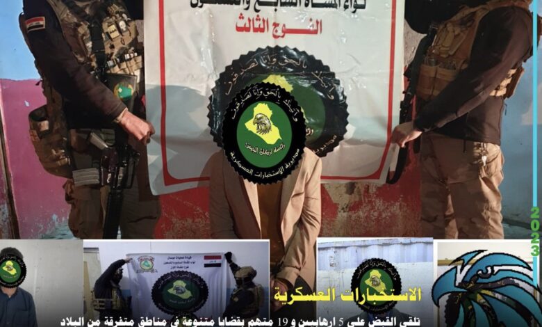 وذكرت المديرية في بيان تلقته (الاولى نيوز )، أنه “بعمليات استباقية وجهود استخبارية متميزة لأقسام وشعب (استخبارات وأمن) قيادة عمليات ديالى وبغداد وميسان والفرق السادسة والسابعة والثامنة والعاشرة السادسة عشر والسابعة عشر وبالتعاون مع استخبارات وقوة من ألوية تلك القيادات، تم نصب كمائن محكمة في المحافظات ( بغداد والانبار وميسان وديالى ونينوى وكركوك ) حيث أسفرت عن إلقاء القبض على( 5 ) إرهابيين مطلوبين للقضاء وفق أحكام المادة( 4 إرهاب ) في قضاء الطارمية والقائم والرمادي وناحية تل عبطة”.
