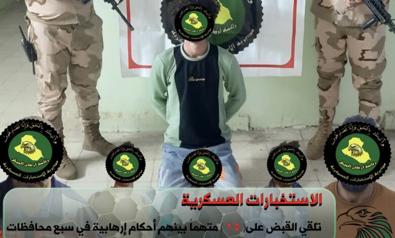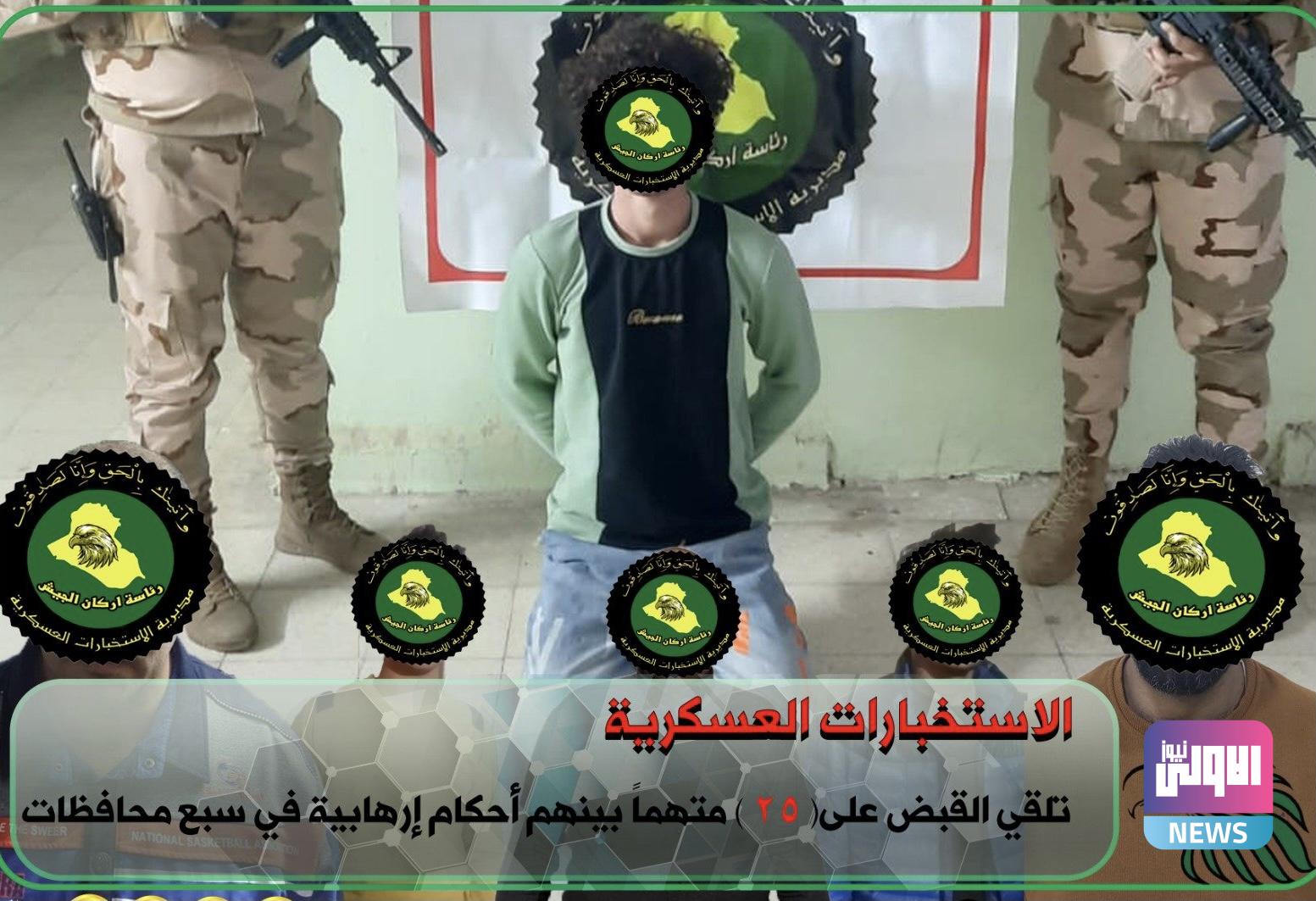 اعلنت مديرية الاستخبارات العسكرية، اليوم السبت، عن القبض على ( 25 ) متهماً بينهم أحكام إرهابية في سبع محافظات.