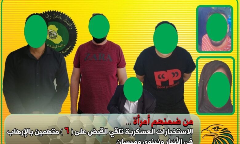 وقالت المديرية في بيان تلقته (الاولى نيوز)، انه “وفقاً لمعلومات استخبارية دقيقة لقسم وشعبتي قيادة عمليات ميسان والفرقة العاشرة والسادسة عشر التابعة الى مديرية الاستخبارات العسكرية وبالتعاون مع القوات البرية المتواجدة في قواطع المسؤولية ومن خلال كمائن محكمة في مناطق متفرقة من المحافظات ذاتها، أسفرت عن القاء القبض على 6 متهمين بالارهاب وفق احكام المادة الرابعة من قانون مكافحة الارهاب في قضائي الفلوجة والمجر الكبير وناحيتي الشورى والصقلاوية”.