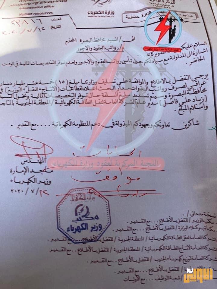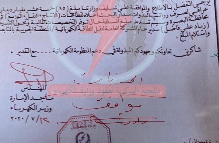 وجهت وزارة الكهرباء، كتابا إلى محافظ البصرة تطلب فيه الموافقة على تسليفها مبلغ ١٥ مليار دينار لغرض تسديد رواتب موظفي العقود والأجور.