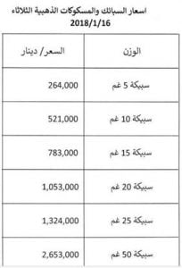 واوضح الجدول” ان سعر سبيكة 25 غم بلغت مليون و324 دينارا وبارتفاع بلغ 9 الاف دينار، فيما بلغت سعر سبيكة 50 غم مليوني و653 الف دينار وبارتفاع بلغ 19 الف دينار”.