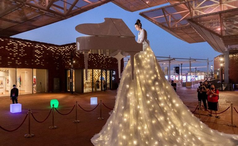 إليانورا كوستانتيني جلست على مقعد يختفي خلف ضخامة ثوبها الأبيض الناصع كثوب زفاف، وبدأت العزف أمام جمهور جلس على كراسٍ مضيئة أكملت الأجواء الفنية الرائعة للعرض الفني الذي يقدمه إكسبو 2020 للمرة الأولى في الهواء الطلق، ويستمر العرض حتى شهر فبراير/ شباط المقبل.