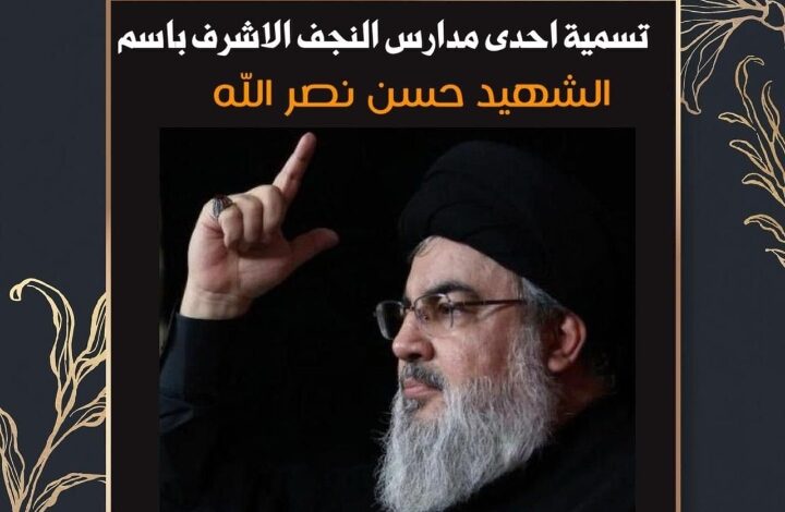 وقالت الوزارة في بيان تلقته (الاولى نيوز) إن “تم تسمية إحدى المدارس في محافظة النجف الأشرف باسم الشهيد أمين عام حزب الله اللبناني السيد حسن نصر الله”.