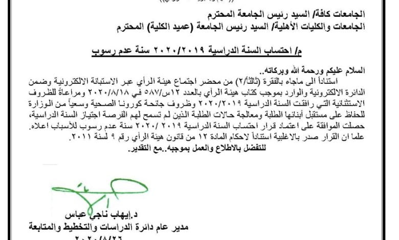 الرئيسية/المحلية/التعليم تعلن احتساب العام الدراسي 2019/ 2020 سنة عدم رسوب ( وثيقة ) المحلية التعليم تعلن احتساب العام الدراسي 2019/ 2020 سنة عدم رسوب ( وثيقة ) Manager Awla2020-08-27 أقل من دقيقة فيسبوك X واتساب تيلقرام مشاركة عبر البريد Manager Awla2020-08-27 أقل من دقيقة فيسبوك X واتساب تيلقرام مشاركة عبر البريد