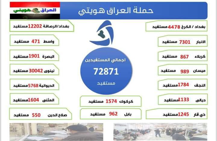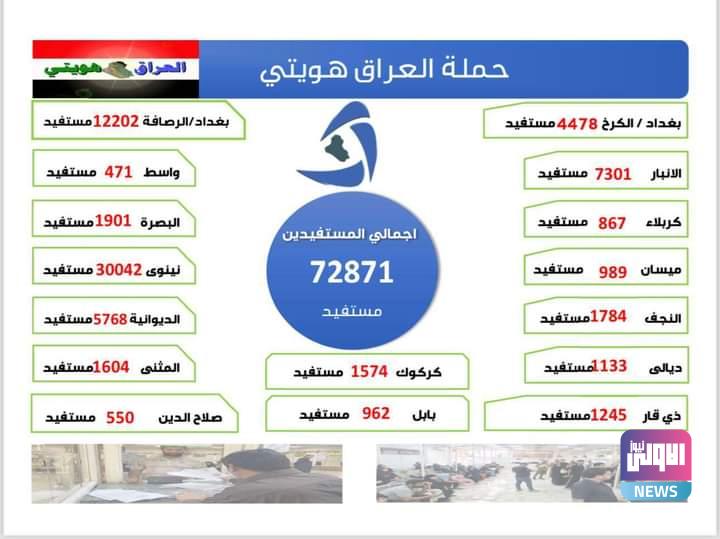 وقال عضو الفريق، مسؤول اللجنة المشرفة على حملة (العراق هويتي) العقيد سيف عبد الكريم في بيان تلقته (الاولى نيوز)، أن “دوائر الأحوال المدنية في بغداد والمحافظات عدا إقليم كردستان العراق، أصدرت (72871) بطاقة وطنية موحدة مجاناً للمشمولين بشبكة الحماية الاجتماعية”.