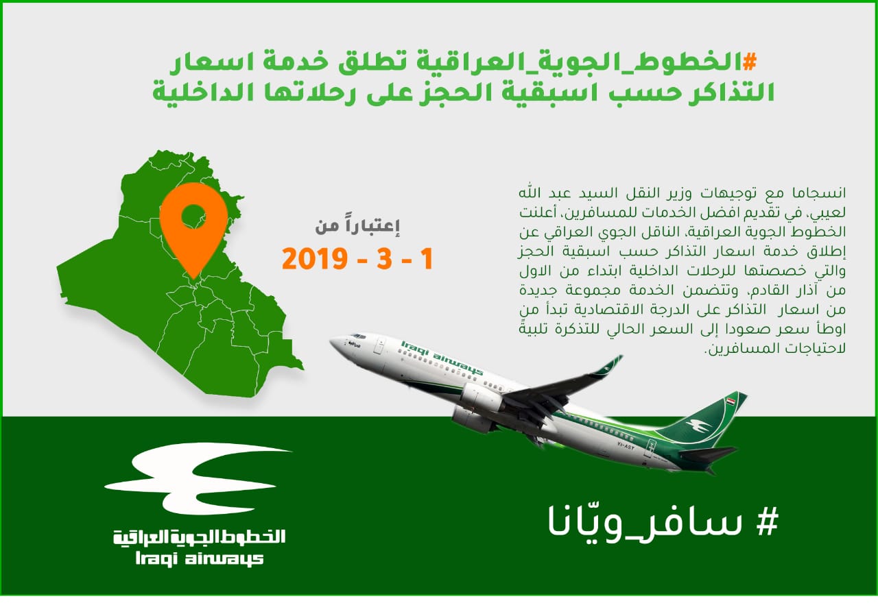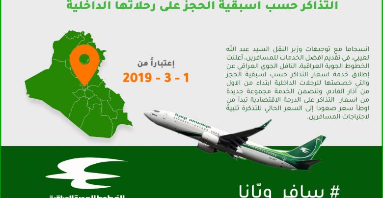 انسجاما مع توجيهات وزير النقل السيد عبد الله لعيبي، في تقديم افضل الخدمات للمسافرين، أعلنت الخطوط الجوية العراقية، الناقل الجوي العراقي عن إطلاق خدمة اسعار التذاكر حسب اسبقية الحجز والتي خصصتها للرحلات الداخلية ابتداء من الاول من آذار القادم، وتتضمن الخدمة مجموعة جديدة من اسعار التذاكر على الدرجة الاقتصادية تبدأ من اوطأ سعر صعودا إلى السعر الحالي للتذكرة تلبيةً لاحتياجات المسافرين.