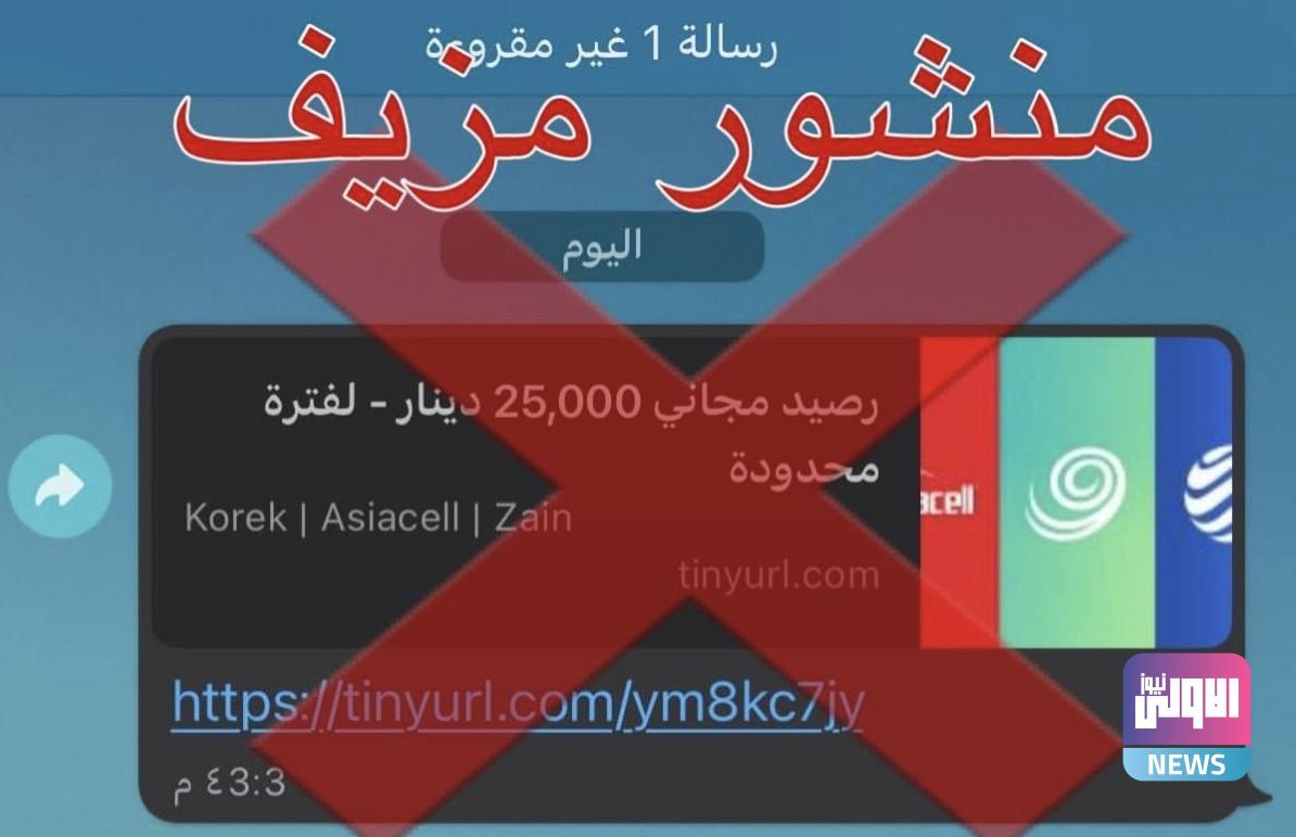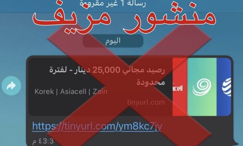 وقال قسم محاربة الإشاعات في تنويه تلقته (الاولى نيوز) إنه “تظهر بين فترة وأخرى وعلى مواقع التواصل الاجتماعي روابط وهمية مفادها بأن شركات الهاتف المحمول تقوم بتقديم هدايا على شكل (رصيد مجاني بقيمة 25 ألف دينار) لمشتركي الخطوط المدفوعة مسبقاً”.