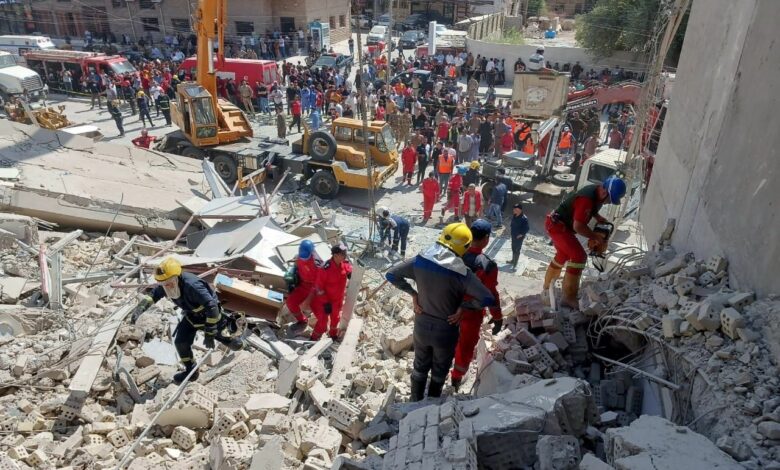 الدفاع المدني ينتشل جثتي طفلة وأمها من تحت ركام بناية المختبر الوطني