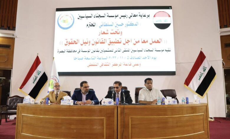 وقالت المؤسسة في بيان تلقته (الاولى نيوز ): إنها “عقدت ملتقى الحوار الثاني في المركز الثقافي النفطي في محافظة البصرة للمشمولين بقانونها، وقد حضر الملتقى رئيس المؤسسة حسين السلطاني وعضو مجلس النواب فالح الخزعلي ومحافظ البصرة اسعد العيداني وعدد من مسؤولي المؤسسة وجمع من السجناء والمعتقلين والمحتجزين السياسيين”.