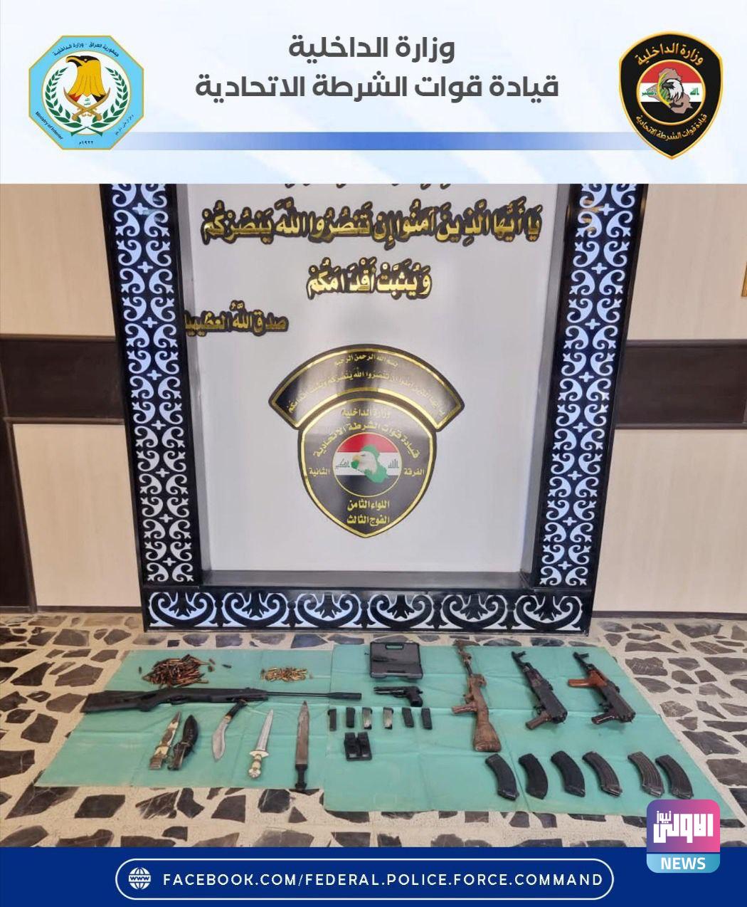 ضمن الجهود الأمنية المستمرة لقطعات الشرطة الاتحادية والتي تضمن حفظ سلامة المواطنين وتأمين حماية المناطق ، نفّذت قوة من اللواء الثامن الفرقة الثانية شرطة اتحادية بالاشتراك مع مفارز استخبارات اللواء التابعة لوكالة الاستخبارات والتحقيقات الاتحادية ودوريات النجدة ، عملية تفتيش على السلاح غير المرخص ومصادرة مجموعة من الأسلحة والمستلزمات العسكرية ضمن منطقة (الكاظمية) في بغداد ، أسفرت بالعثور على 4 بنادق مختلفة الانواع ، مسدس ، 12 مخازن أسلحة متنوعة ، حافظة مسدس مع عدة ، 123 اطلاقة بندقية كلاشنكوف ، 55 اطلاقة مسدس ، 3 حربة ،