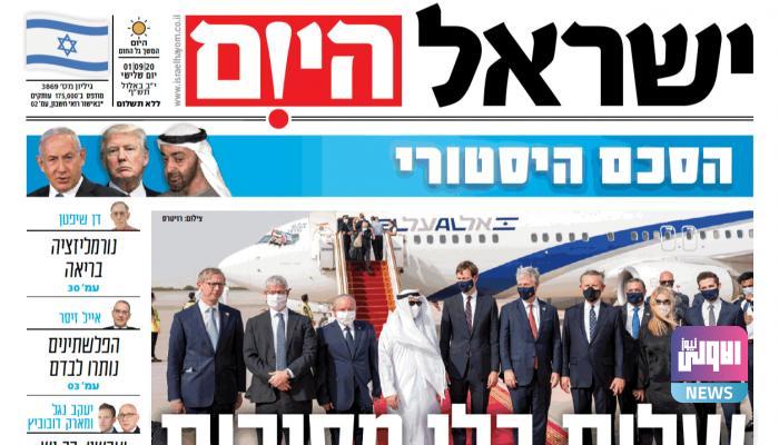 وبصورة الطائرة التي حطت على أرض مطار أبوظبي، زينت الصحف الإسرائيلية صدر صفحاتها الأولى، وكلمة السلام تعلوها.