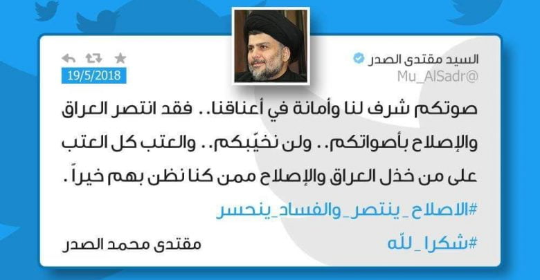 ال زعيم التيار الصدري السيد مقتدى الصدر في اول تعليق على نتائج الانتخابات وتصدر سائرون ان”‏صوتكم شرف لنا وامانة في اعناقنا.. فقد انتصر العراق “.