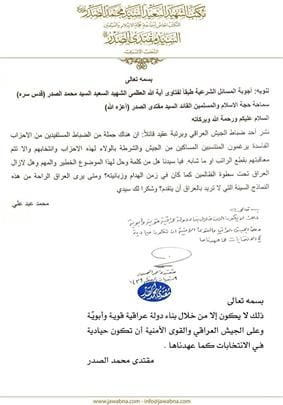 وحول ممارسة بعض ضباط الجيش المستفيدين من الاحزاب الفاسدة، الضغوط على المنتسبين لاغراض انتخابية – بحسب السائل – قال الصدر ” على الجيش العراقي والقوة الأمنية أن تكون حيادية كما عهدناها “./