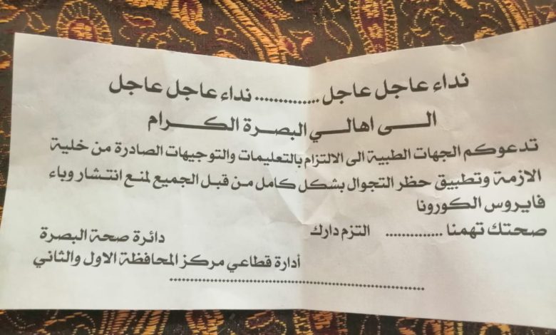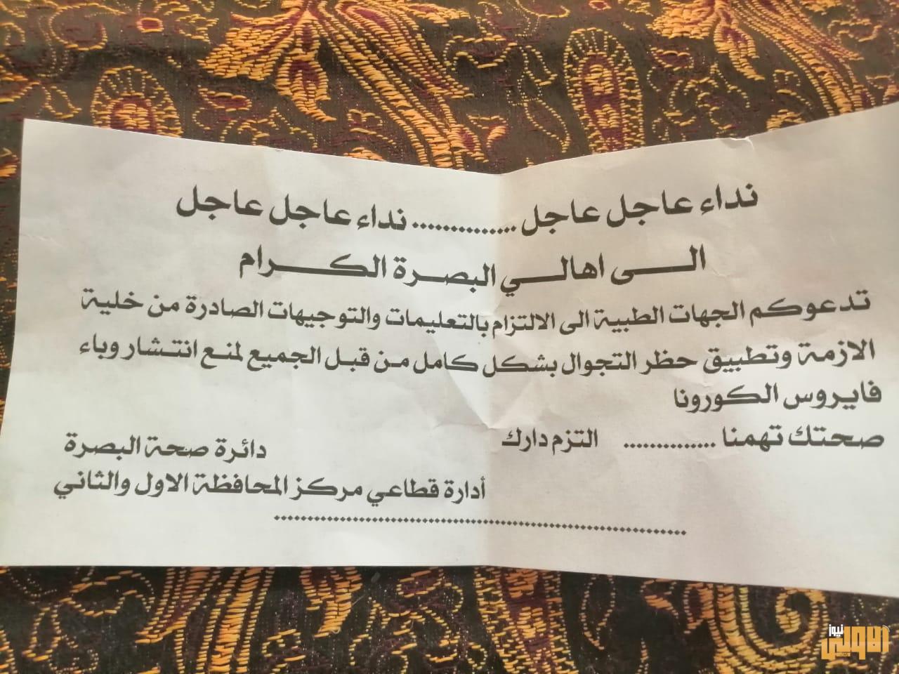 قام الطيران الحربي العراقي برمي منشورات في محافظة البصره تحثهم فيها على ماجاء من خلية الازمة بشأن حظر التجوال وبشكل كامل ومن قبل الجميع
