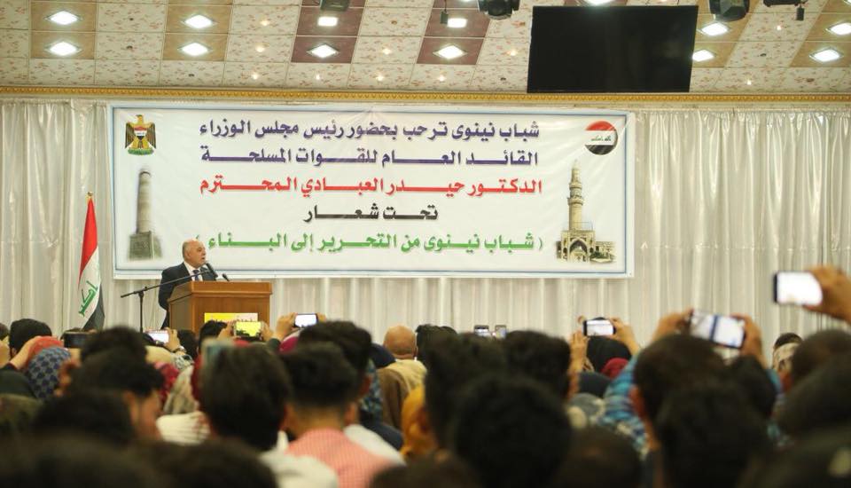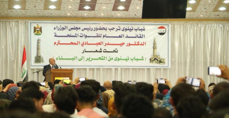 وذكر العبادي في كلمته خلال تجمع كبير لشباب نينوى وتحت شعار ( شباب نينوى من التحرير الى البناء) اليوم” ان النصر الذي تحقق على عصابات داعش كان بجهود الشباب والابطال المقاتلين من اجل تحرير الانسان، مبينا اننا انتصرنا بوحدتنا وان الدواعش ارادوا تفرقتنا لكننا انتصرنا عليهم بالوحدة”.