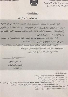 وجاء في الامر الديواني الصادر عن مكتب العبادي، وحصلت عليه وكالة ” الاولى نيوز ” انه ، تمت اقالة احمد رحيم عبدالله المفتش العام لوزارة الصحة من منصبه على وفق احكام المادة / 2/ من الامر رقم/ 19/ لسنة 2005″.