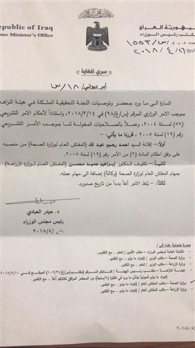 وأضاف انه ” تم تكليف ابراهيم حميد محسن المفتش العام لوزارة الزراعة بمهام المفتش العام لوزارة الصحة/ وكالةً/ اضافة الى مهام عمله” ، مشيراً الى تنفيذ الامر بدءاً من تأريخ صدوره./