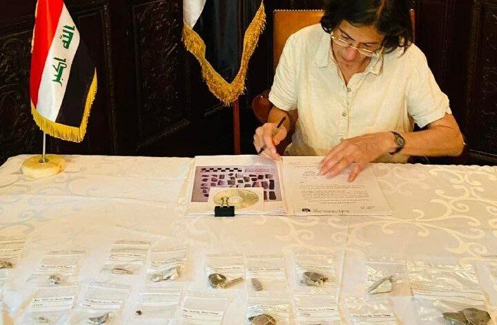 وذكر بيان للوزارة تلقته (الاولى نيوز)، ان “سفارة جُمهوريَّة العراق في برلين، تسلمت (125) قطعة أثريّة من قبل سوزان بولوك من معهد آثار الشرق الأدنى التابع لجامعة برلين الحرة”، مبينا ان “القطع، مُستعارة لغرض الدراسة منذ التسعينيات من موقع ابوصلابيخ تعود إلى حقبة أوروك (4)”.