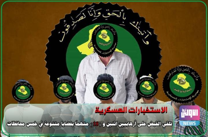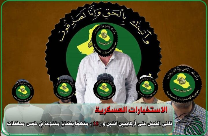 أعلنت مديرية الاستخبارات العسكرية، اليوم الاثنين، القبض على إرهابيين اثنين و18 متهماً بقضايا مختلفة في خمس محافظات.