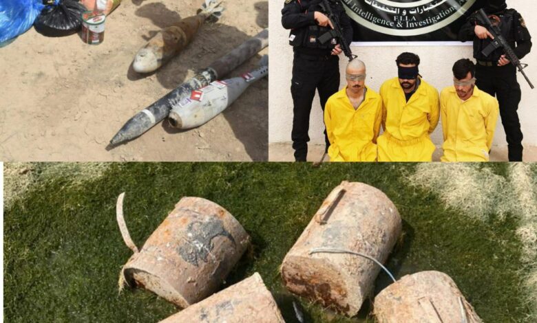 وتابع ان “مفارز وكالة الاستخبارات في كركوك ضبطت ايضا مخبأن وكدس عتاد تابعة الى عصابات داعش في وادي ابو خناجر وقرية خربة عزيز ضمن المحافظة، بداخلهما (8) قنابر هاون عيار 60 ملم و(4) عبوات نوع بلازما محلية الصنع و(4) عبوات قمعية وقنبرتان هاون عيار 120 وصاروخ موجة ومواد غذائية جافة وخطوط اتصال مختلفة، مبينة انه “تم التعامل مع المواد المضبوطة دون حادث يذكر”.