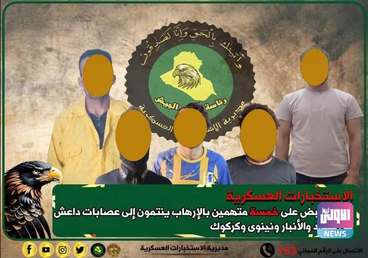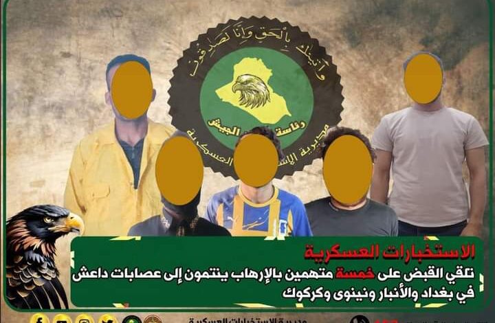 أعلنت مديرية الاستخبارات العسكرية، اليوم الاثنين، عن القبض على خمسة متهمين بالإرهاب في 4 محافظات.
