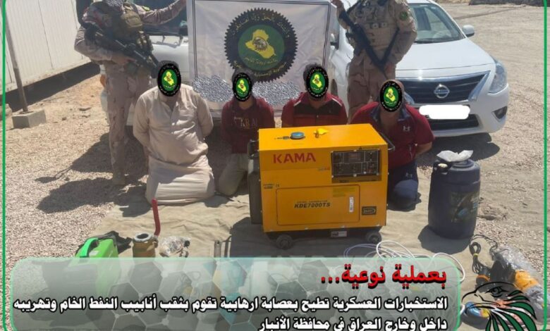وأضاف البيان، أنه “تم نصب كمين محكم في منطقة السفرية التابعة إلى قضاء الرمادي، أسفر عن إلقاء القبض على عصابة إرهابية مكونة من أربعة عناصر تقوم بثقب أنابيب النفط الخام وتهريبه داخل وخارج العراق وأيضاً تتقاضى مبالغ كبيرة من الأموال ببيع وتهريب النفط الخام”، مبيناً، أن ” العملية جاءت بعد استدراج رئيس العصابة من قبل مفارزنا البطلة لفترة طويلة حتى ضبطتهم متلبسين بالجرم المشهود في محافظة الأنبار”.