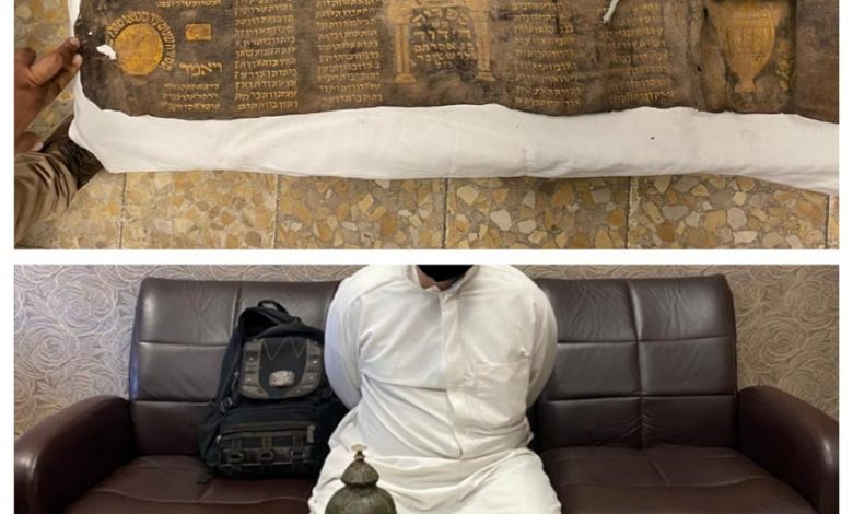 واضافت، أنه “تم القبض عليه بالجرم المشهود وبحوزته قطعتين اثريتين عبارة عن مخطوطات باللغة العبرية عليها رسوم ونقوش ومرصعة بالاحجار الكريمة تعود الى العصور القديمة”، مبينا أنه “تم تنظيم محضر ضبط بالمواد وايداع المتهم التوقيف لاتخاذ الإجراءات القانونية بحقه”.