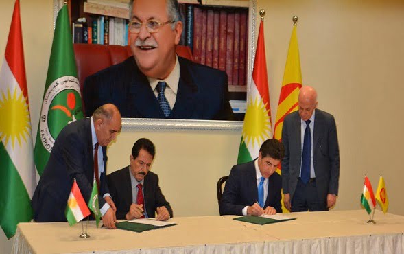 وقال القيادي البارز في الاتحاد اريز عبد الله في تصريحات نقلتها الاولى نيوز، ان “الاحزاب الكردية وابرزها حزبي الاتحاد الكردستاني والديمقراطي الكردستاني اتفقوا جميعا على ان يكون الحوار هو المبدأ الاساسي في حلحلة جميع الخلافات في اقليم كردستان او داخل حكومة بغداد”، مشيرا الى ان “الاجتماع الاخير بين الاحزاب الكردية كان ايجابيا جدا حيث اتفق الجميع على السعي لخدمة الشعب الكردي وانهاء جميع الخلافات حول النفط وكركوك والمناطق المتنازع عليها مع بغداد”.