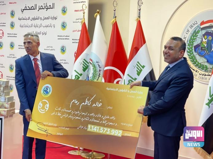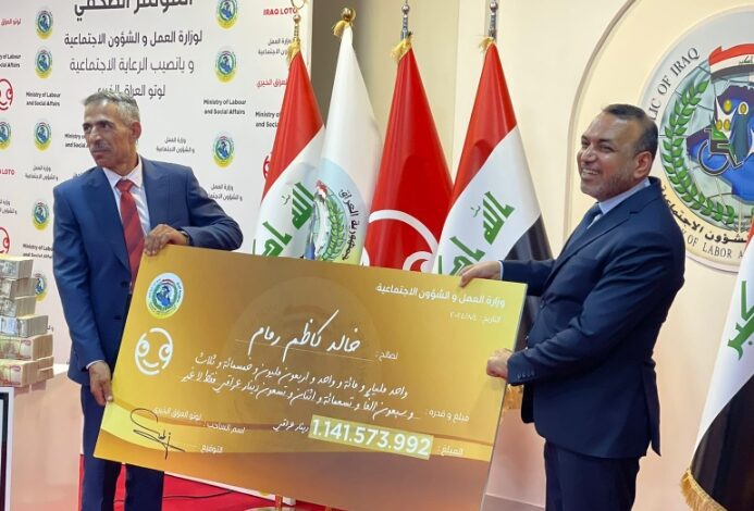 سلم وزير العمل والشؤون الاجتماعية، احمد الاسدي، اليوم الاحد، اكبر جائزة لمواطن عراقي فاز بسحبة اللوتو الخيري للحماية الاجتماعية، بقيمة 1،141،573،992 دينار عراقي.