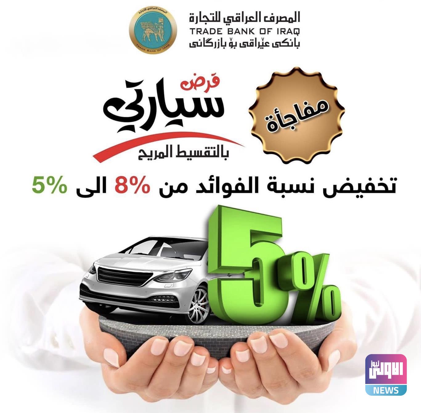 اعلن المصرف العراقي للتجارة، اليوم الاحد، تخفيض فائدة قرض شراء السيارات من 8 الى 5 بالمئة، فيما اشار الى شمول جميع المواطنين بالتقديم عليه.
