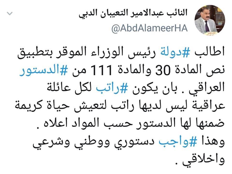طالب النائب عن حركة الصادقون عبدالامير التعيبان الدبي في تغريدة على تويتر، اليوم الربعاء ، رئيس مجلس الوزراء عادل عبد المهدي بتخصيص راتب لكل عائلة عراقية لا تمتلك راتب وحسب ماجاء في الدستور العراقي.