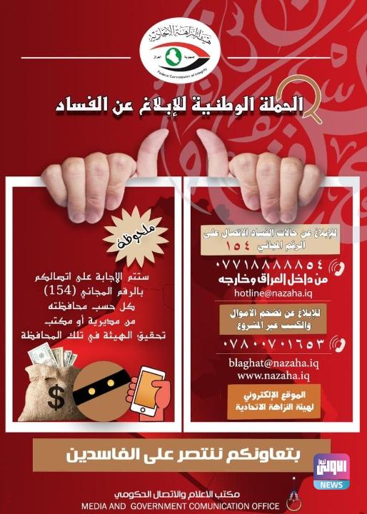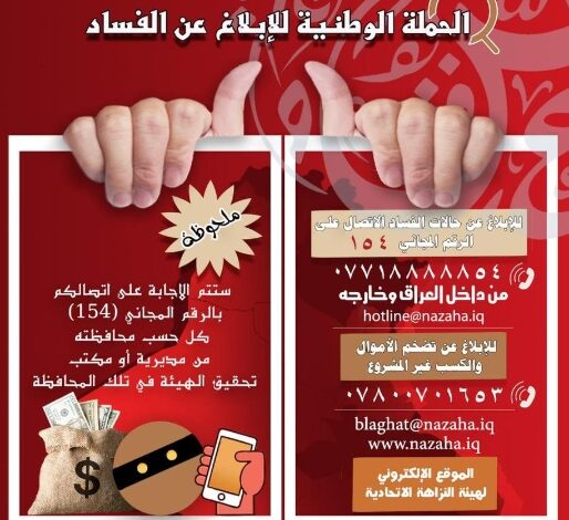 وأهابت الهيئة “بالمواطنين التعاون معها في مكافحة الفساد بمختلف أشكاله، سواءٌ ما يتعلق بالرشى والمساومة والابتزاز، أو الاختلاس وهدر المال العام وتجاوز الصلاحيَّات ومخالفة الواجبات الوظيفيَّة وغيرها سواء بالرقم المجاني، أوعبر الخط الساخن بالرقم (07718888854)، المُخصَّص لتلقّي الاتصالات من جميع المحافظات، ومن خارج العراق وفقاً لآلية الدفع المسبق”.