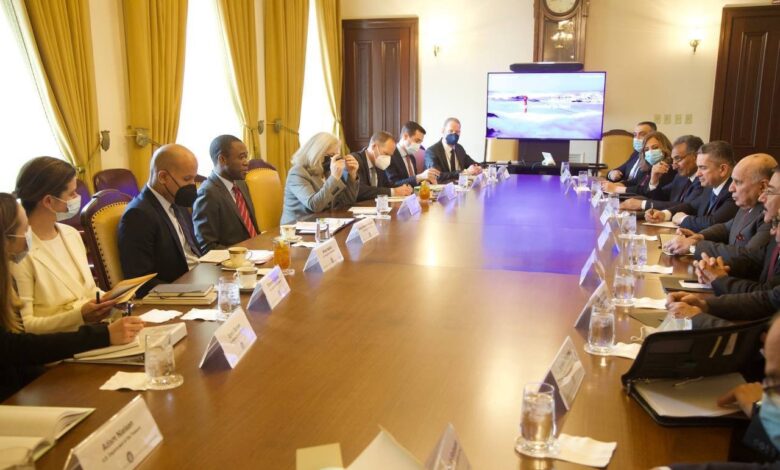 وقال المتحدث باسم وزارة الخارجية أحمد الصحاف في بيان تلقته (الاولى نيوز): إن “نائب رئيس مجلس الوزراء وزير الخارجية فؤاد حسين والوفد المرافق له التقى مع نائب وزير الخزانة الأميركية والي أدييمو ومساعد وزير الخزانة اليزابيث وكبار موظفي الوزارة المعنيين بالعراق والشرق الأوسط”، لافتاً الى أنه “تمَّ خلال اللقاء مناقشة القضايا ذات الاهتمام المشترك والتعاون الثنائيّ بين البلدين”.