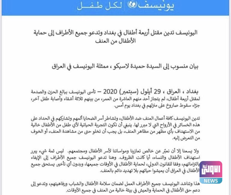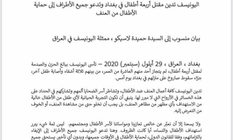 وجاء في بيان لممثلة اليونيسف في العراق، حميدة لاسيكو، ان “اليونيسف تأسى ببالغ الحزن والصدمة لمقتل أربعة أطفال،