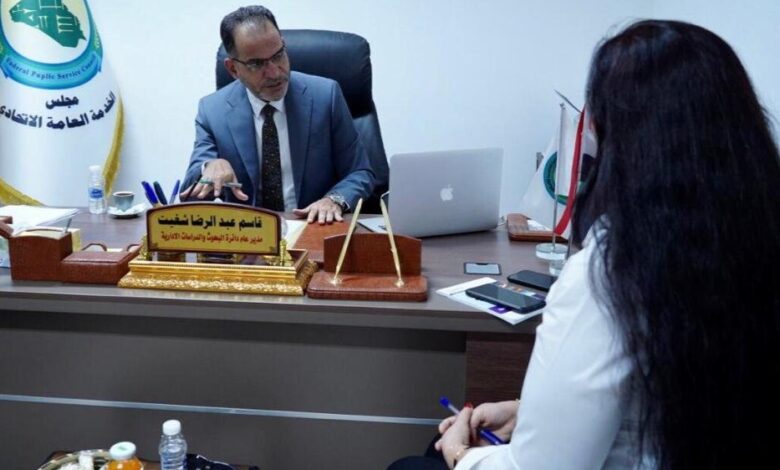 وبشأن هيكلية عمل المجلس ، أكد، أن “مجلس الخدمة العامة الاتحادي يعاني من قلة التخصيصات المالية وقلة عدد الكادر والبالغ (40) موظفاً على ملاك المجلس و(119) موظفاً منسباً و(15) موظفاً مكلفاً من مختلف الوزارات والمؤسسات مع وجود هيكلية خاصة به مع العرض أن المجلس لا يملك بناية مخصصة له”.