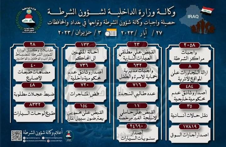 وذكرت الوكالة في بيان تلقته (الاولى نيوز)، أن “حصيلة الواجبات الأمنية والخدمية والإنسانية في بغداد والمحافظات للفترة من 27 آيار 2023 ولغاية 3 حزيران 2023، موزعة كالتالي:-