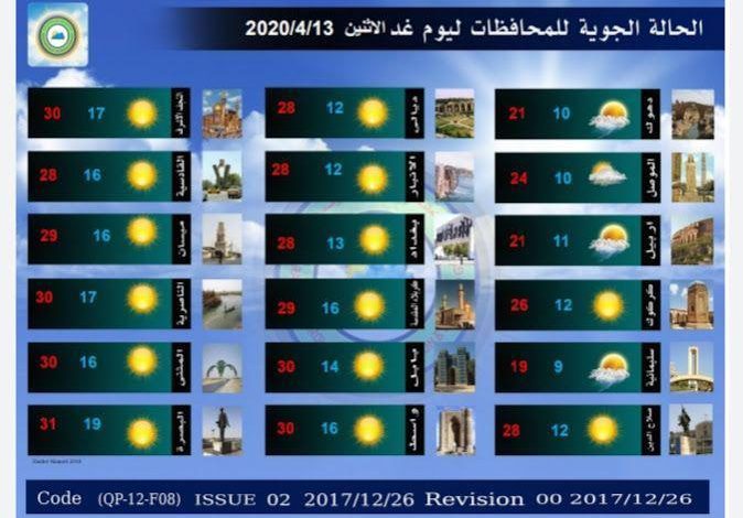 أعلنت هيئة الأنواء الجوية عن تقريراً لحالة الجوية لهذا اليوم الأحد و الأيام التي تليه مع تقرير كميات الترسبات المائية النازلة في محطات العراق خلال ال 24ساعة الماضية صادرة من قسم التنبؤ الجوي في الهيئة العامة للأنواء الجوية والرصد الزلزالي إحدى تشكيلات وزارة النقل.