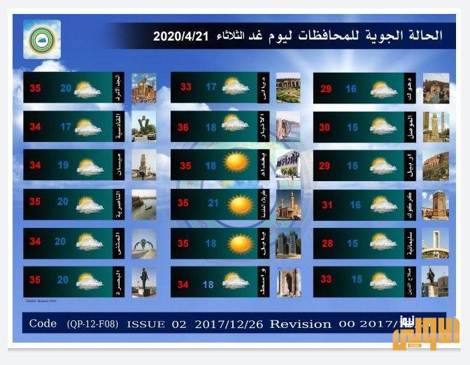 اعلنت وزارة النقل عن الحالة الجوية لهذا اليوم الاثنين الموافق 20/4/2020 والأيام التي تليه صادرة من قسم التنبؤ الجوي في الهيئة العامة للأنواء الجوية والرصد الزلزالي إحدى تشكيلات وزارة النقل.