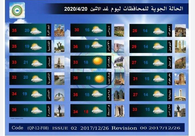 الحالة الجوية لهذا اليوم الاحد ، والأيام التي تليه مع تقرير كميات الترسبات المائية النازلة في محطات العراق خلال ال 24ساعة الماضية صادرة من قسم التنبؤ الجوي في الهيئة العامة للأنواء الجوية والرصد الزلزالي إحدى تشكيلات وزارة النقل.
