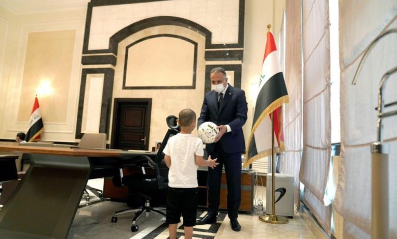 بالصور..الكاظمي يلعب كرة القدم مع طفل مصاب بالسرطان