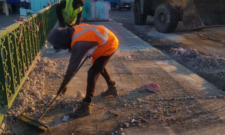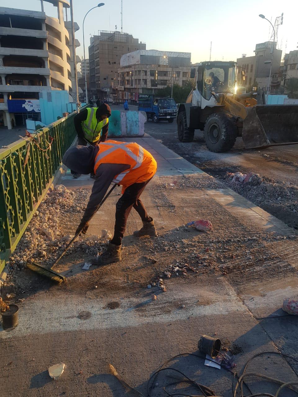 بالصور.. تنظيف جسر السنك بعد رفع الكتل الكونكريتية عنه