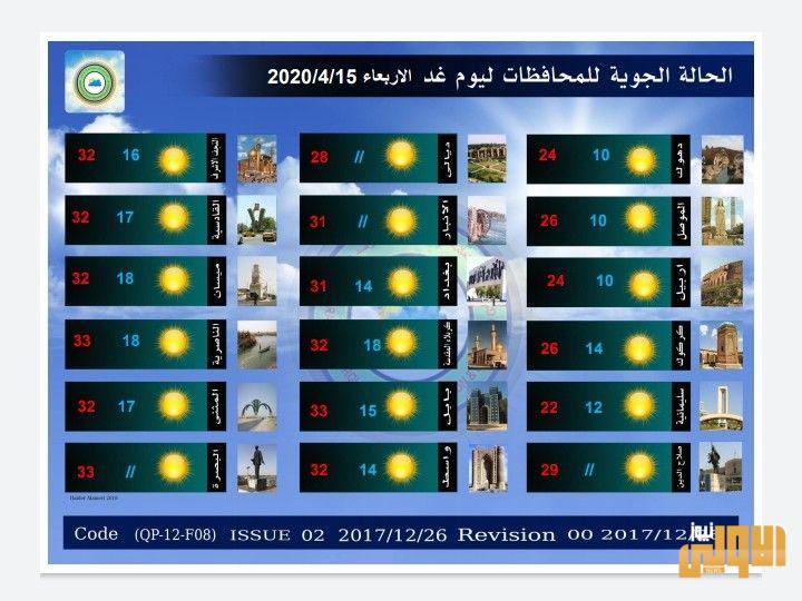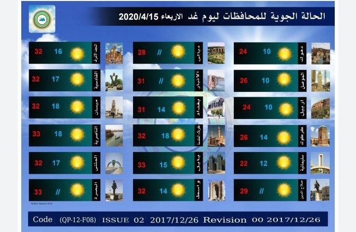 اعلنت هيئة الانواء عن الحالة الجوية لهذا اليوم الثلاثاء ، والأيام التي تليه صادرة من قسم التنبؤ الجوي في الهيئة العامة للأنواء الجوية والرصد الزلزالي إحدى تشكيلات وزارة النقل .