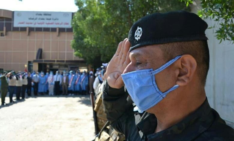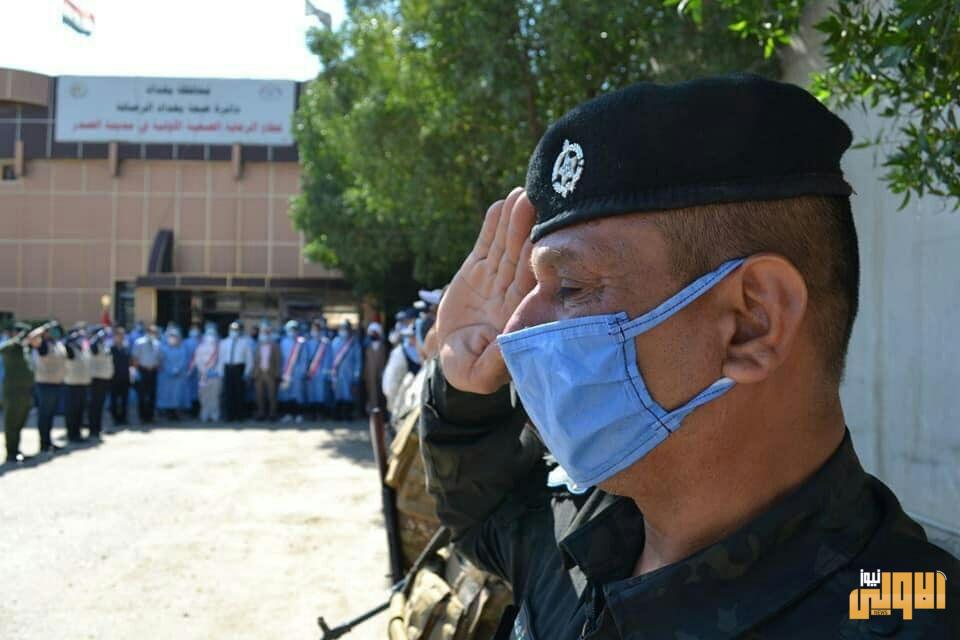 ضبّاط ومنتسبين من وزارة الداخليّة يؤدّون التحيّة مع عزف النشيد الوطني لملاكات خليّة الأزمة في قطّاع الصدر.