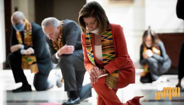 وركعت بيلوسي والنواب الديمقراطيون على ركبة واحدة، تكريما لذكرى فلويد، قبل كشف النقاب عن حزمة إصلاحات شاملة للشرطة الأمريكية ردا على مقتل أمريكيين أفارقة على أيدي قوات إنفاذ القانون.