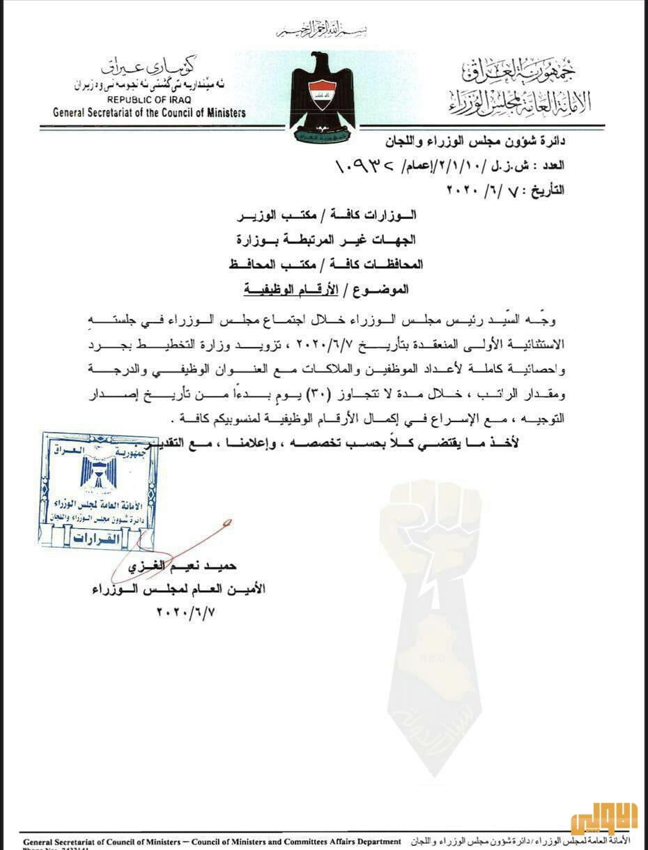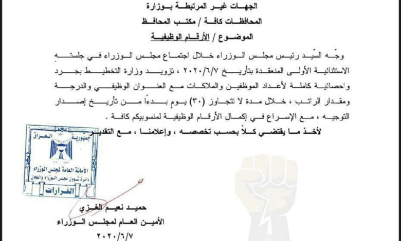 الرئيسية/المحلية/بالوثيقة.. أمانة مجلس الوزراء توعز بجرد مقدار رواتب الموظفين في جميع الوزارات المحلية بالوثيقة.. أمانة مجلس الوزراء توعز بجرد مقدار رواتب الموظفين في جميع الوزارات Manager Awla2020-06-09 أقل من دقيقة فيسبوك X واتساب تيلقرام مشاركة عبر البريد Manager Awla2020-06-09 أقل من دقيقة فيسبوك X واتساب تيلقرام مشاركة عبر البريد