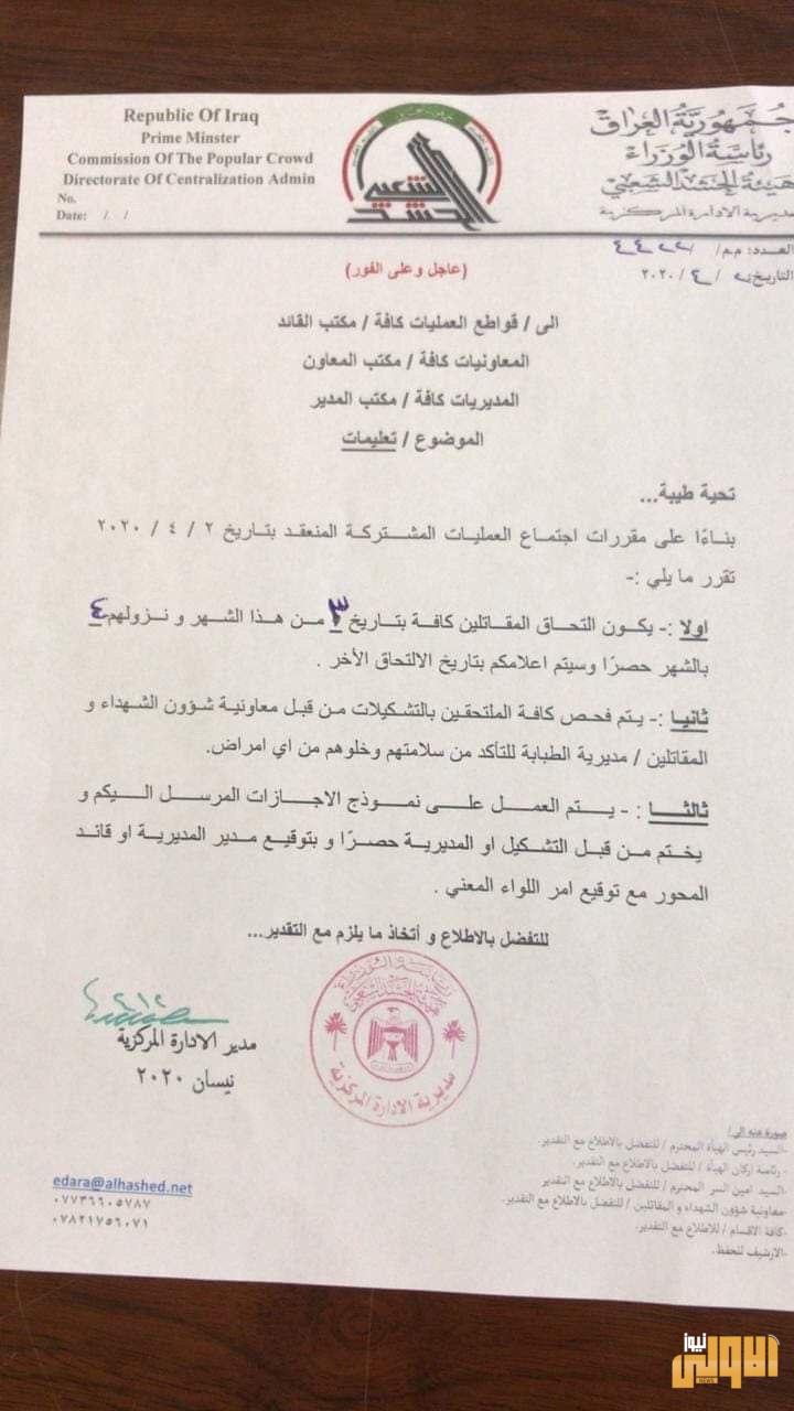 بالوثيقة.. إطلاق الإجازات لمنتسبي الحشد الشعبي